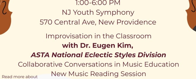 Saturday, October 25, 2025 1:00 PM to 6:00 PM New Jersey Youth Symphony 570 Central Ave, New Providence, NJ 07974 EVENTS: ~Session: Improvisation in the Classroom with Dr. Eugen Kim, ASTA National Eclectic Styles Division ~Roundtables: Collaborative Conversations in Music Education ~Reading Session: New Music ~Dinner & Raffle of Reading Session Music REGISTRATION COSTS: