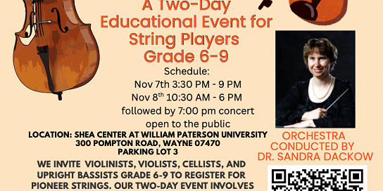 November 7-8, 2025 Shea Center at William Paterson University 300 Pompton Rd, Wayne, NJ 07470 A Two-Day Educational Event for String Players Grade 6-9 Orchestra conducted by Dr. Sandra Dackow We invite violinists, violists, cellists, and upright bassists grade 6-9 to register for Pioneer Strings. Our two-day event involves rehearsing classic repertoire with conductor